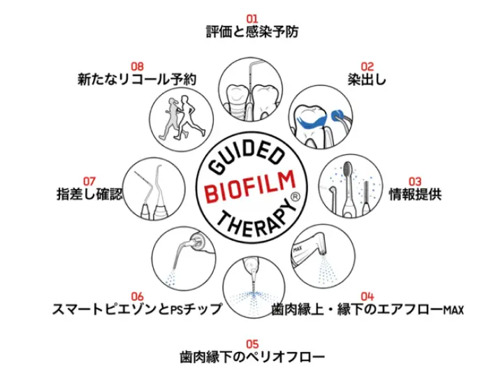 ガイデッドバイオフィルムセラピー(Guided Biofilm Therapy, GBT)は、歯の表面や歯周ポケット内に存在するバイオフィルム(細菌の膜)を、傷つけず効率的に除去するための最新のクリーニング法です。